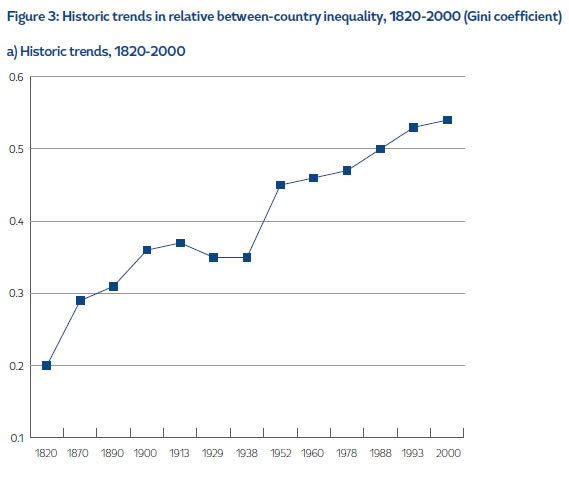 Recent estimates from Milanovic (2012; 2013) suggest that the current level of relative between-country inequality is even higher than previously thought (Figure 3b). The reason for the higher inequality levels being that the PPP estimates from the 2005 survey of the International Comparison Program (ICP) led to a downward revision of PPP-adjusted GDP estimates in many developing countries (e.g. by 40% in China and India).9 Figure 3b also shows that, after a relatively steep inequality increase in the 1990s, the 'Great Divergence' between countries not only stopped but that it was replaced by a convergence process from 2000 onwards.