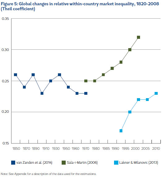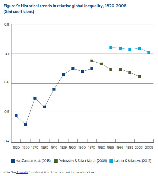 ''It is not possible to reach a definite conclusion regarding the direction of the change in [relative] global inequality over the last three decades of the twentieth century'' (Anand and Segal, 2008, pg. 90), given the wide array of data sources and methodologies used to estimate the measures.15 And although recent estimates from two distinguished inequality researchers, Sala-i-Martin and Milanovic, suggest that it is likely that relative global inequality declined during the last two decades (Figure 9), ''these changes are probably not robust to plausible standard errors (if one could formulate and calculate them)'' (Lakner and Milanovic, 2013, pg.48). Having said that, there exists a broad consensus that relative global income inequality increased sharply between 1820 and 1950 (Bourguignon and Morrisson, 2002; van Zanden et al., 2014), and that today's relative global inequality levels are much higher than they were in 1820. Moreover, they are also much higher than today's inequality levels within countries (with the notable exception of Angola, Namibia, and South Africa) and between countries.