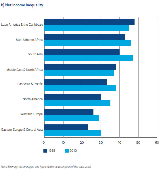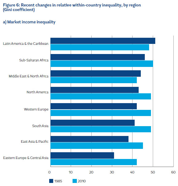 If one compares regional inequality averages for the year 2010 with that of the year 1985, it be comes apparent that both relative market and net income inequality increased significantly within Northern American, European, Asian and Sub-Saharan African countries, whereas it declined moderately within Latin American and Caribbean (LAC) and Middle Eastern and North African countries (Figure 6).12 The outcome of these diverging trends is that today the market income Gini averages of all regions are relatively similar, with values between 42 and 50. This finding challenges Kuznets' (1955, 1965) inverted-U hypothesis of income inequality that states that economic development first leads to a rise and later to a decline of income inequality within countries.13