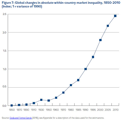 With regard to absolute global inequality, the three papers with these estimates unanimously report a sharp increase in inequality. Atkinson and Brandolini (2010) find that the absolute Gini coefficient increased strongly throughout the period 1820-1992 (with an especially sharp increase after 1950), while Anand and Segal (2015) report that this strong growth continued between 1992 and 2005. The most recent data presented by Goda and Torres García (2016) confirm these findings (Figure 10). More precisely, their estimates show a continuous increase in absolute global inequality during 1850-2010 that accelerated after 1950: ''in the first one hundred years of our sample, the average annual growth rate of absolute global inequality was 3.0%, whereas it was 4.3% between 1950 and 2010'' (pg. 8).