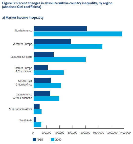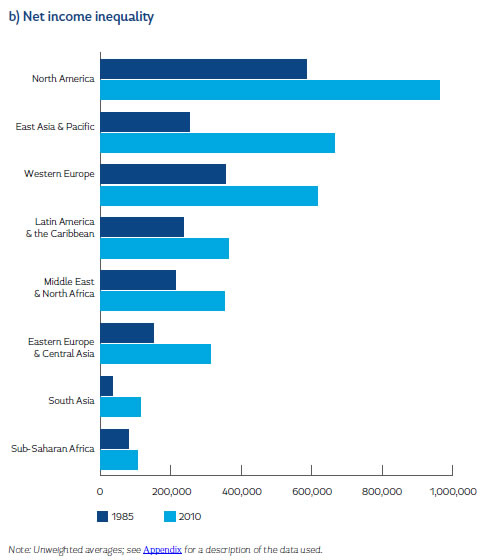 In contrast to relative within-country inequality, the level of absolute market and net income inequality increased in all regions between 1985 and 2010 (Figure 8).14 The relatively modest increase in Sub-Saharan Africa was mainly due to the low real absolute income growth within this region (on average, +341/capita in 1990 $PPP); whereas the relatively strong mean income growth of LAC (+3,180/capita) and the Middle East and North Africa (+3,440/capita) more than offset the relative inequality decrease within these regions (see Figure 6). The stark increase of absolute inequality in the other regions was due to the strong increase in real mean incomes and a large increase in relative inequality levels.