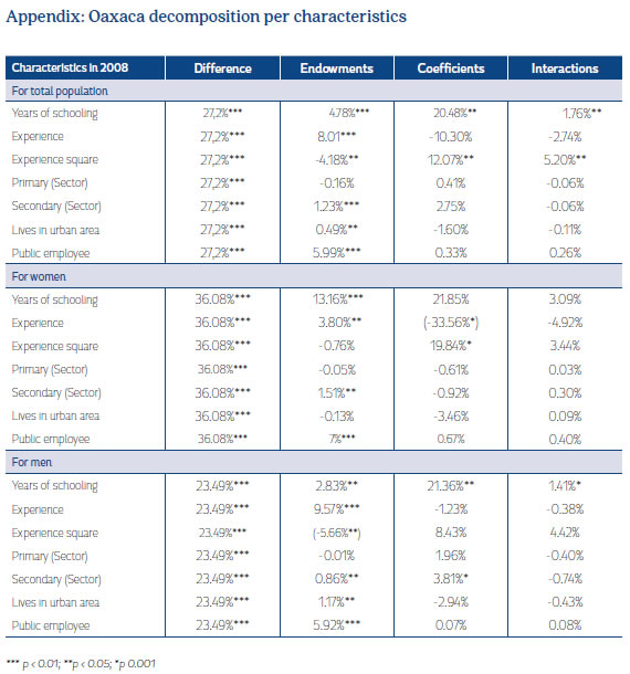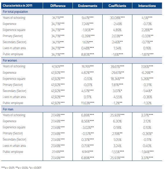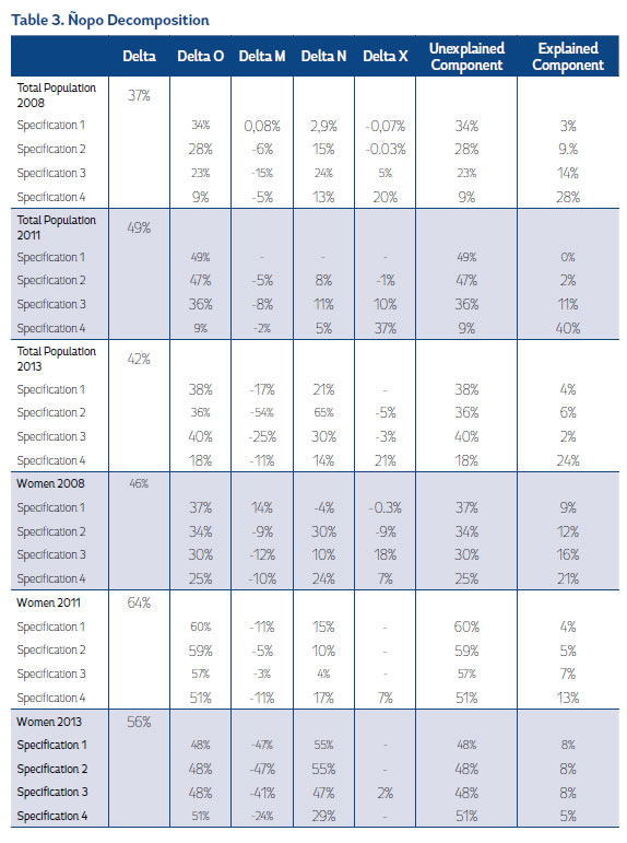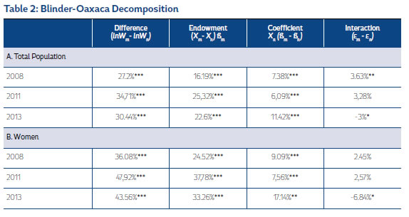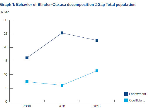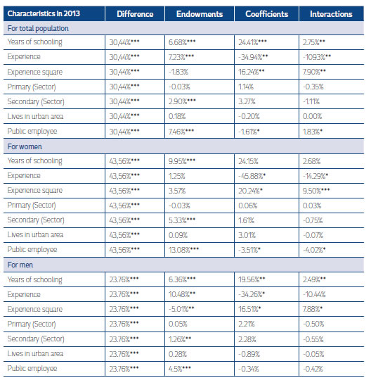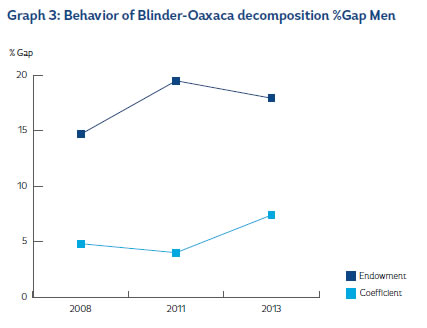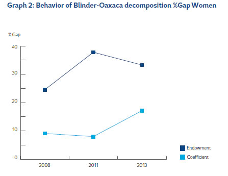 Additionally, for 2013 the gap was 30.4%, which was less than previous years, showing a decrease in the payment to endowments (22.6%), and an increase in the coefficient (11.4%), meanwhile, the interactive term has somewhat of an equalizing effect on the wage gap (-3%).
