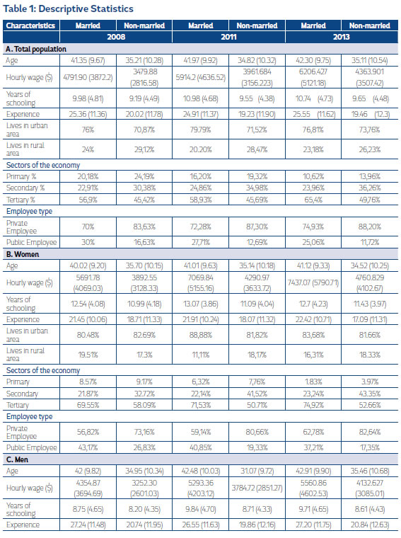 For the years studied non-married people have lower wage than their counterparts, although, married people on average are increasing their level of education. The hourly wage calculated from the principal wage divided by the working hours for the principal employment shows that there is a wage gap between married women and non-married women, also for married men and non-married men. For married women the average hourly wage gap is increasing rapidly through time. Similarly for married men the hourly wage gap increases between 2008 and 2011 and then it stabilizes around 42%. These gaps are not comparable because of the existence of different characteristics related to earnings, such as schooling, experience, age, sectors of the economy, and employee type that indicates if the worker works in the public or private sector.