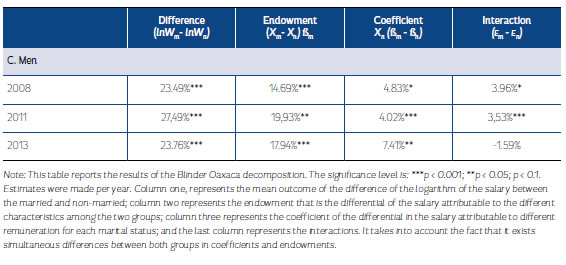 Married men earn more than non-married men;, the marriage wage premium is 23.5%, 27.5% and 23.7% for the years 2011, 2008, and 2013 respectively. It is important to note that the share of the payment for the greater endowment of married men increases from 52.1% in 2008, 72.5% in 2011 to 73.8% in 2013. If non-married men had the same characteristics as married men, they would incur a penalty of 4.8% in 2008, 4.1% in 2011, and 7.4% in 2013. The interactive term measures the effects of differences in endowments and coefficients that occur simultaneously, showing that if the married men had the same productivity as the non-married men, their wages would increase 4.0% and 3.5% for the years 2008 and 2011. For 2013 the effect is not significant.