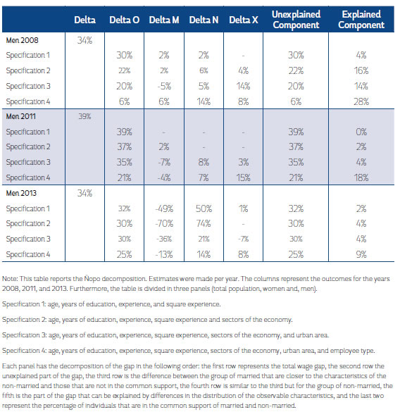 For 2011, we found that the gap is 49.3% for the total population, with the married workers the ones that earn more. According to Specification 4, only 18% of the total gap is not explained by observable characteristics and it can be attributed to discrimination in favor of married workers, while Δx + Δn + Δm explain the remaining 82%. According to the Ñopo decomposition, married women earn about 64.8% more compared to married women outside of common support, which reduces this wage premium in 11%; it is also important to note that non-married women with different characteristics from married ones increase the gap by 17%. We also found employer favoritism for married women of 7%. For married men, it is important to show that the wage premium is 39.9%, but if we have a group of married and non-married men with similar characteristics, we observe that the wage is reduced by 4% for those who do not have similar characteristics, and the wage is increased a 15% for those who have the same characteristics as married men.