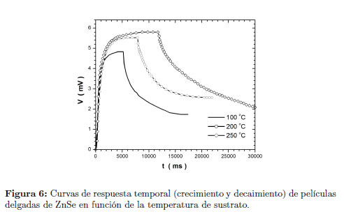 La Figura 6 muestra las curvas de respuesta temporal de las películas delgadas de ZnSe como función de la temperatura de sustrato, para un voltaje de polarización de 20 Voltios y un haz de iluminación de 370 nm de longitud de onda.