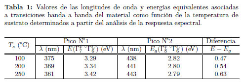 De la tabla se observa que los tiempos de crecimiento disminuyen en al menos un orden de magnitud al incrementar la temperatura de sustrato desde 100 a 250 °C. Esta disminución puede estar asociada con el aumento del tamaño de grano en las muestras. Como se mencionó en la sección anterior, las muestras preparadas a temperaturas de sustrato bajas presentan un crecimiento policristalino con cristalitos de dimensión reducida rodeados por fronteras de grano. En las muestras preparadas a bajas temperaturas de sustrato la densidad de fronteras de grano por unidad de volumen es alta. Estas fronteras de grano actúan como sitios de captura de carga, estos centros después de cierto tiempo van liberando la carga lo que incrementa el tiempo de respuesta de las muestras [15]. Al incrementar la temperatura de sustrato el tamaño de grano aumenta y la densidad de fronteras disminuye en el material lo que implica también una reducción en la densidad de trampas lo que ocasiona que el tiempo disminuya.