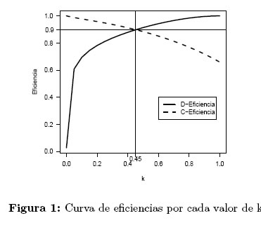 En la literatura, para elegir la constante de ponderación más adecuada, se reporta una técnica basada en el cálculo de las eficiencias de cada uno de los diseños óptimos compuestos, ξk, con respecto a cada criterio de optimalidad involucrado, D- y c- optimalidad. Para cada valor de k (k ∈ (0,1)), se encuentra el diseño compuesto ξk que maximiza la relación (1). Luego, se calculan las eficiencias EfD(ξk) y Efc(ξk), obteniendo funciones monótonas para k ∈ (0, 1). El valor de k donde se cortan las dos funciones estará asociada con el diseño óptimo ξcD [11].