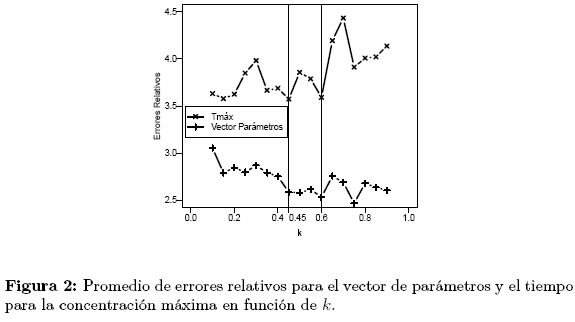 Los errores relativos asociados al vector de parámetros tiende a decrecer mientras que los asociados al tiempo para la concentración máxima tiende a crecer levemente a medida que el valor de k aumenta, Figura 2. Existen dos posibles valores de k en donde simultáneamente los errores relativos son pequeños, k = 0.45 y k = 0.60, los diseños óptimos compuestos asociados a estos dos valores garantizan una estimación óptima tanto del vector de parámetros del modelo como del tiempo para la concentración máxima. Esta metodología aporta un diseño óptimo adicional al obtenido por el método de las eficiencias. Los diseños asociados se encuentran en la Tabla 3.