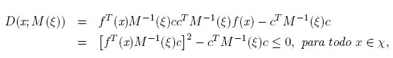 • D(x;M(ξ)) := fT (x)M-1(ξ)f(x) − p ≤ 0 para todo x ∈ χ.
