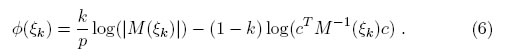 La expresión dada en (5) resulta de calcular el logaritmo de la media geométrica de las dos funciones de eficiencia consideradas. Para un valor de k dado, el diseño que maximice ϕ(ξk) se denomina diseño cD-óptimo, obteniendo tantos diseños como valores posibles de k ∈ (0, 1) sean considerados, representados en el siguiente conjunto
