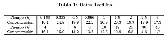 A continuación se ilustra las metodologías anteriores con un ejemplo aplicado en el área de la farmacocinética. Es de anotar que el modelo a considerar también tiene aplicaciones en otras áreas. A un caballo se le suministra una dosis de 15mg/Kg de teofilina en la sangre, y se registra la concentración del medicamento presente en el organismo en muestras de sangre extraídas en diferentes tiempos. Los datos fueron reportados en Fresen (1986), referenciado en Atkinson et al. (2007) [12] y se presentan en la Tabla 1: