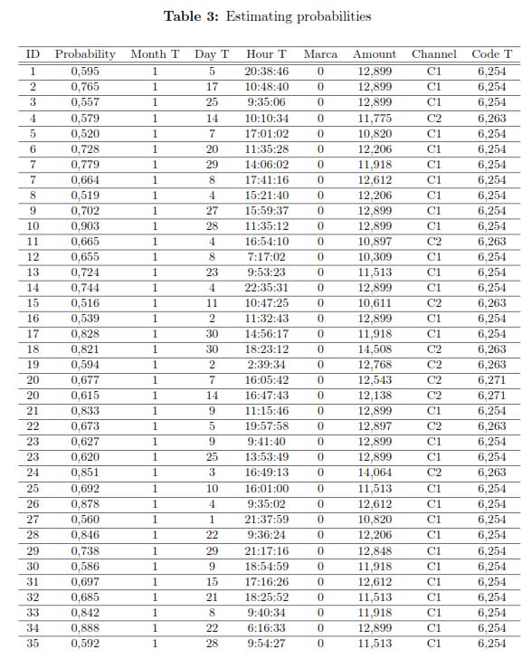 To specify the model for the individual i, the estimation of its intercept i must be considered. In the results, it is observed that for any individuals the month of the transaction, date, time and code transaction contribute negatively to the likelihood that the transaction be suspicious, but as increases the amount of the transaction , the likelihood also increases. Table 3 shows the estimated probabilities of fraud for some individuals in the database.