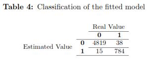 From the information shown in Table 4, specificity, sensitivity, bad classification rate (bcr) and good classification rate (gcr) were calculate: bcr=0.009371 gcr=0.9906 sensitivity=0.9922 specificity=0.9812 According to the literature it is preferable to have a lower misclassification rate because it indicates that the model has few mistakes, while the value of the rate of good classification (gcr) close to 1 is preferred. The sensitivity measures how good are the classifications of the model with the true positives, and specificity measures how good are the classifications of the model with the true negatives. The estimated model with random intercept has very good results, but it is clear that frauds are subject to verification.