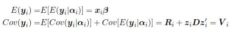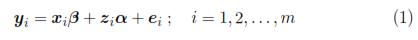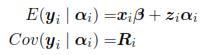where β is a vector of parameters (p x 1) that corresponds to the fixed effects, xi is a matrix for the i-th individual which characterizes the systematic part of the answer; αi is a vector (k x 1) characteristic of the i-th individual, zi is a design matrix (ni x k) and ei is the vector of intra-individual errors. Assumes that eiNni(0,Ri), where Ri is a covariance matrix intra-individual of size (ni x ni). So, from model (1):
