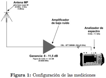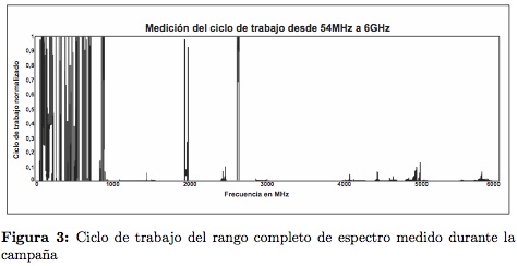 La ocupación del espectro se midió en el intervalo de 54MHz a 6 GHz. El span para cada medición fue menor a 100MHz y fue calculado a partir de (1, 2) cuando la tecnología a medir es conocida, con el fin de garantizar un estimado preciso de ocupación.