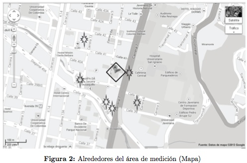 Todas las mediciones se llevaron a cabo en la terraza (octavo piso) del edificio administrativo de la Universidad Distrital Francisco José de Caldas (Bogotá-Colombia). Las coordenadas son las siguientes: latitud = 4°37'4'' norte, longitud = 74°3'7'' Oeste, altitud = 2641 metros. Es importante mencionar que el lugar de las mediciones está rodeado por varios transmisores RF, correspondientes a diferentes servicios de telecomunicaciones. La Figura 2 muestra la ubicación exacta de la parte superior del edificio donde se llevaron a cabo las mediciones (forma cuadrada). Las estrellas alrededor, representan las edificaciones de una altura considerable que obstruyen la línea de vista de la recepción omnidireccional. Las áreas de color blanco y gris en el mapa, indican que no hay obstrucción en la línea de vista.