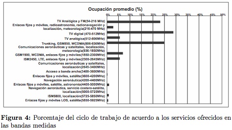 La Figura 4 resume las estadísticas de ocupación promedio de espectro, en función de los servicios de cada banda. Los resultados obtenidos muestran que algunas bandas de espectro están sujetas a moderados niveles de utilización (espectro que es usado; pero no durante todo el tiempo), mientras que algunas otras exhiben usos escasos y, en algunos casos, prácticamente no existe uso.