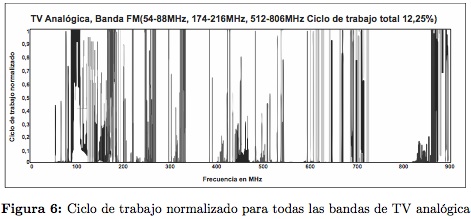A continuación se analiza el ciclo de trabajo de algunas bandas específicas. La banda FM, que se encuentra entre 88-108MHz (Figura 5), presenta niveles de ocupación espectral del 78 %. Por otra parte, como se observa en la Figura 6, los servicios de televisión analógica (54-88MHz, 174-216MHz y 512-806MHz) presentan niveles de ocupación de espectro del 12 %.