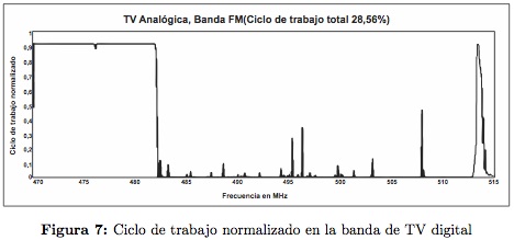 Como se observa en la Figura 7, la banda de televisión digital (entre 470 y 482MHz) presenta una ocupación espectral de aproximadamente el 100 %. No obstante, hay muchos canales individuales desde 482 hasta 512MHz que exhiben niveles bajos de ocupación, lo que conduce a un ciclo de trabajo total del 28.5% para toda la banda que está entre 470 y 512MHz.