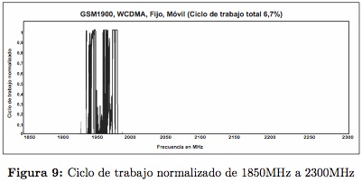 Respecto a la banda del espectro asignada para el enlace ascendente de la banda GSM850, que se encuentra entre 824 y 849MHz (Figura 8), se presenta un ciclo de trabajo total que no supera el 20 %; mientras que para la porción de espectro asignada al enlace descendente de la banda GSM850 (entre 869 y 894MHz), se exhibe un ciclo de trabajo mucho más alto, cercano al 80% en la mayoría de sus canales. Al examinar el enlace ascendente de la banda GSM1900, esto es entre 1850-1910MHz (Figura 9), la ocupación espectral puede ser considerada despreciable en relación con el correspondiente enlace descendente, es decir, la banda entre 1930- 1990MHz, ya que la mayoría de los canales tienen niveles de ocupación espectral cercanos al 100 %. Esto prueba que, incluso para tecnologías de gran demanda (como el servicio de voz de la telefónia celular), se pueden encontrar huecos espectrales.