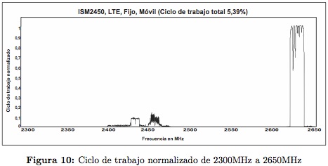 En la Figura 10, la banda ISM (2400-2500MHz) presenta una ocupación de espectro de sólo el 4 %. En esta banda en particular, se miden señales de baja potencia, resultado de la atenuación debida a suelos y paredes; y de los obstáculos en general. Dicha baja potencia es consecuencia de la ubicación en ambientes interiores de los routers Wi-Fi. Adicionalmente, en la Figura 10, se puede observar que la tecnología LTE, cuya banda fue asignada recientemente en Colombia (2500-2525MHz y 2620-2645MHz), alcanza niveles actuales de ciclo de trabajo del 42 %. Es importante mencionar que este ciclo de trabajo para LTE lo aporta la banda superior (84 %), ya que la banda inferior está prácticamente vacía.