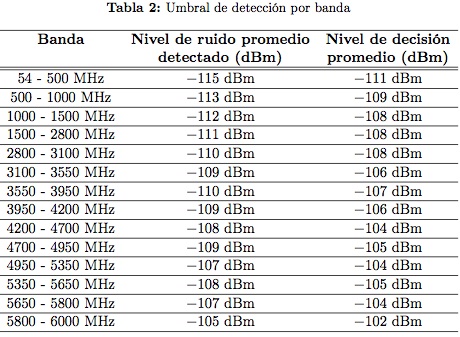 Donde, PI es la potencia de la señal a la entrada y PN es la potencia de ruido equivalente a la entrada. El objetivo era tener tanta sensibilidad como fuera posible en el receptor con el uso del amplificador, evitando que los niveles de espurios pudieran ser detectados como actividad de un usuario primario (usuario licenciado). El ruido promedio del instrumento para cada medida fue determinado con la ubicación de una impedancia de 50Ω a la entrada del analizador de espectro, con una atenuación de 0 dB, detección RMS y un tiempo de medición de 6h. Los niveles de decisión (λ) se presentan en la Tabla 2, y se encontraron a partir de (4) con una Probabilidad de Falsa Alarma (Pfa) del 1% [23] y [24]: