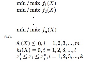 Un problema es multiobjetivo cuando existen varios objetivos y estos se encuentran en conflicto, es decir, que una solución considerada de buena calidad para uno de los objetivos puede ser al mismo tiempo de mala calidad para otro objetivo. Por lo tanto el concepto de solución en la optimización multiobjetivo adquiere un nuevo sentido. En este caso las metodologías usadas no suministran una solución que es simultáneamente buena para todos los objetivos, ya que entregan un conjunto de soluciones óptimas [7]. Un problema multiobjetivo se representa mediante un conjunto de funciones objetivo que pueden ser minimizadas o maximizadas y un conjunto de restricciones de desigualdad, igualdad y limites de las variables que describen el problema, como se ilustra a continuación: