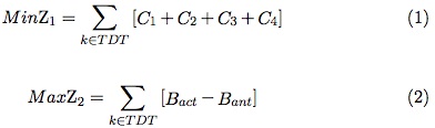 La función objetivo que se presenta en la ecuación (2) (Z2), representa la maximización del beneficio debido al costo reconocido por activos de transformación según lo estipulado en la Resolución CREG 097 de 2008. El costo del beneficio es calculado como la diferencia entre el beneficio de la configuración actual (Bact) y la anterior (Bant), donde este último corresponde al obtenido con la configuración inicial, por lo que este valor es constante durante todo el proceso de reubicación. Los términos Bact y Bant se describen a continuación.