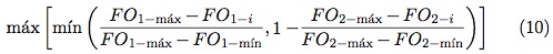 Para interpretar esta métrica se emplea la Figura 1, en la cual se aprecian las soluciones (i − 1), i e (i + 1), y los extremos de cada objetivo. Asumiendo que FO1,mín = 200, FO1,máx = 1000, FO2,mín = 5 y FO2,máx = 15, y que las tres soluciones tienen como resultado los valores (300 - 6), (550 - 8) y (900 - 12), al resolver solamente el paréntesis de la ecuación (10), se tienen los siguientes valores: (0,87 - 0,10), (0,56 - 0,30) y (0,12 - 0,70), respectivamente. Luego al obtener el mínimo valor de cada pareja se tiene para las tres soluciones: 0,10, 0,30 y 0,12. Finalmente se determina el máximo valor de estos tres números, el cual corresponde a la solución i (0,30). De esta forma se observa como esta métrica permite definir un punto que se encuentre equidistante a los valores máximos y mínimos de cada objetivo.