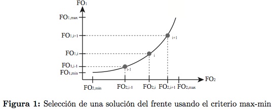 Es preciso recordar que en un problema multiobjetivo no se tiene una única solución, si no un conjunto de soluciones óptimas, por lo que la mejor solución depende de los intereses específicos de cada empresa. Sin embargo, existen en la literatura diferentes formas de encontrar la mejor solución de un frente óptimo de Pareto. En este trabajo se empleó el criterio max-min debido a que permite seleccionar una solución que sea equidistante a los extremos de cada objetivo [8]. Este criterio es calculado como sigue: