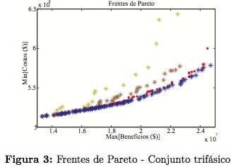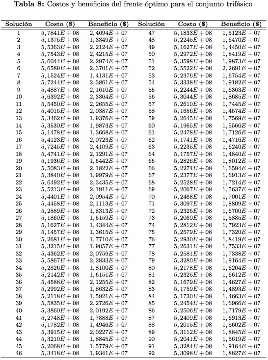 Se observa que cada solución del frente óptimo de Pareto para los conjuntos monofásicos y trifásicos es mejor que la configuración inicial (caso base) en ambos objetivos, ya que es menor que la función objetivo 1 (problema de minimización) y mayor que la función objetivo 2 (problema de maximización), lo cual respalda la eficiencia de la metodología planteada en este trabajo.