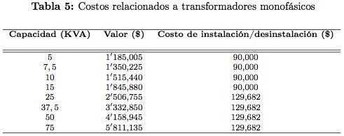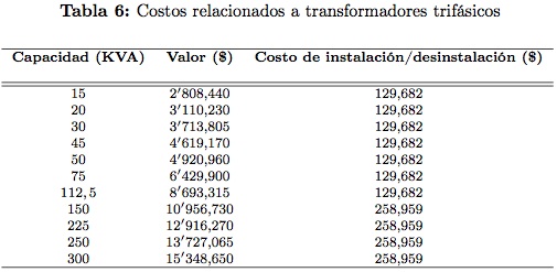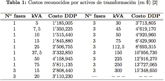 Como se mencionó en la sección anterior, el costo reconocido por concepto de activos de transformación depende directamente de la cargabilidad que presente cada uno de los transformadores. De acuerdo a esto el valor reconocido por un transformador será el valor del transformador reportado por el OR si este cumple con una cargabilidad mayor o igual al 40% de su valor nominal; en caso contrario el valor reconocido será el de un transformador con capacidad menor que cumpla con dicha cargabilidad. El costo reconocido por cada transformador según la CREG, se muestra en la Tabla 1.