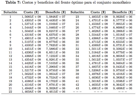 En la Figura 2 se observa la evolución del algoritmo durante su ejecución y los diferentes frentes de Pareto generados. Los puntos de color amarillo, café y rojo representan los frentes de Pareto en la iteración 10, 25 y 40, respectivamente. El frente óptimo de Pareto está conformado por los puntos de color azul. Las 43 soluciones de este frente se ilustran en la Tabla 7.