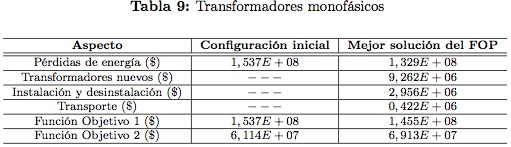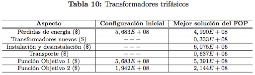 La comparación de los resultados obtenidos para la configuración inicial (sin reubicación de transformadores), con respecto a la mejor solución obtenida del frente óptimo de Pareto (FOP) usando la ecuación (10) (para cada caso), se presenta a continuación en las Tablas 9 y 10. Como la función objetivo Z2 es obtenida a partir de la diferencia del valor actual con respecto al caso base, para efectos comparativos se debe adicionar el valor del caso base a la mejor solución del frente de Pareto.
