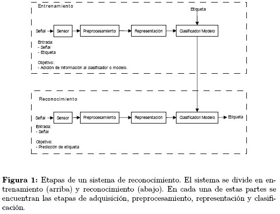 Los procesos de análisis de señales acústicas se pueden llevar a cabo mediante algoritmos computacionales de reconocimiento. El objetivo de ello es tener la capacidad de analizar grandes cantidades de datos en lapsos cortos de tiempo y, además, permitir que ésto se haga de una forma sistematizada. La tecnología para el análisis automatizado de sonidos se ha enfocado casi completamente en reconocimiento del habla humana; sin embargo, hay una gran necesidad para la detección automatizada y clasificación de sonidos naturales no humanos [30]. En procesamiento de habla se han producido muchos avances en el análisis de series de tiempo, por esta razón, muchas de las técnicas que se usan en monitoreo bioacústico se apoyan en estas metodologías [4]. Los modelos de reconocimiento de voz generalmente se basan en la caracterización del vocabulario y la gramática. De manera similar, en las vocalizaciones de animales acústicamente activos, por ejemplo en aves, se pueden distinguir unidades básicas similares a los fonemas y, estructuras más complejas como cantos o frases [31], que son la base para crear los modelos de identificación automatizada [32]. En la Figura 1 se presenta un esquema de un sistema de monitoreo automatizado, se resalta que aunque este documento está orientado particularmente a los sistemas basados en señales acústicas, se puede adaptar fácilmente a un esquema que incluya datos de imágenes o datos del entorno tales como ubicación, condiciones atmosféricas, etcétera. En un sistema automatizado se distinguen dos partes: 1) entrenamiento y 2) reconocimiento; en el entrenamiento se diseña el mecanismo de inferencia a partir de información a priori; el reconocimiento consiste en el uso del sistema para la clasificación automatizada de la señal de entrada.