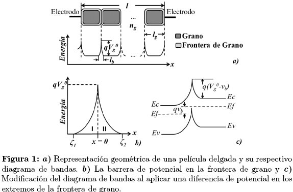 En este artículo solo se consideran dos mecanismos por medio de los cuales los electrones se mueven a través de las fronteras de grano: emisión termoiónica y túnel mecánico cuántico. Si se asume que el mecanismo de transporte electrónico en las fronteras de grano es emisión termoiónica, la relación corriente voltaje para la barrera se puede expresar como [29],[30]: