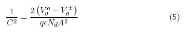El signo ± depende de si la polarización de la barrera de potencial es directa o inversa. Debido a la separación de carga cerca a la superficie del SMO, existe una capacitancia debida a la carga espacial. La capacitancia resultante se puede aproximar a la de un capacitor de placas paralelas y representar de la siguiente manera: