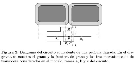 Después de examinar los mecanismos de transporte electrónico en los granos y a través de las fronteras de grano en un SMO, se propone un circuito eléctrico equivalente simplificado para simular la característica I-V de las películas de SMO. La Figura 2 muestra el diagrama de este circuito. En este circuito, la resistencia Rg es la resistencia del grano, la cual es común a cualquiera de los tres mecanismos de conducción que fueron discutidos. La conducción a través de la frontera de grano en sí, se representa por tres lazos, denominados a, b y c. Si el mecanismo de conducción predominante en la frontera de grano es el de emisión termoiónica, la conducción tiene lugar por el lazo a del circuito.
