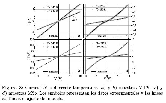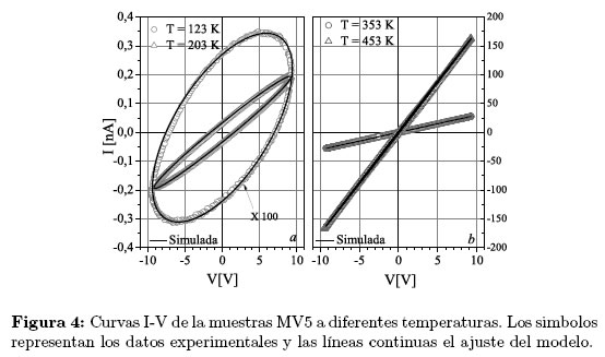 La Figura 4 muestra la característica I-V de las películas MV5 medidas a diferente temperatura. En estas muestras, es evidente el efecto capacitivo asociado, según la ecuación (25), a la recombinación y generación de portadores en la frontera de grano. Este efecto es muy notorio a bajas temperaturas (Figura 4a). A medida que se incrementa la temperatura (Figura 4b), el mecanísmo dominante es el de emisión termoiónica de portadores en el cual I ∝ T2, según se muestra en la ecuación (9). Los valores de la capacitancia C y de la resistencia asociada Rc varían desde 1,29 pF y 1,8 × 1012 Ω, para la muestra a 123 K hasta 3,28 μF y 5,7 × 107 Ω, para la muestra a 453 K. El aumento en los valores de la capacitancia con el incremento de la temperatura se corresponde con el aumento de la concentración de portadores Ng en los estados electrónicos de la interfase. La Figura 3c muestra un efecto de histéresis que se simula con gran exactitud considerando la contribución de los lazos b y c del circuito equivalente, utilizando porcentajes de conducción por cada uno de los lazos (b y c) se ajustó la curva experimental a la teórica.
