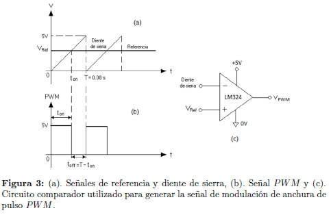 La señal PWM es generada por medio de un amplificador operacional LM324, que opera como comparador de entradas. Como se observa en la Figura 3(c), las entradas del comparador son una señal diente de sierra con periodo T = 80ms y amplitud de 5V , generada por la tarjeta de adquisición de datos, la cual ingresa por la entrada inversora del amplificador, y la señal de referencia VRef también generada por la tarjeta, la cual ingresa por la entrada no inversora del amplificador. Mientras el voltaje de la señal de referencia sea mayor que el voltaje de la señal diente de sierra, la diferencia entre estas señales es positiva; al ser la ganancia de voltaje del comparador igual a la ganancia en lazo abierto del amplificador, la cual es mucho mayor que la unidad, el amplificador pasa inmediatamente al estado de saturación. La salida del amplificador en estado de saturación es muy próxima a su voltaje de alimentación, en este caso +5V . Por otro lado, cuando la señal de referencia es menor que la señal diente de sierra, la diferencia entre ambas señales es un voltaje negativo, que al ser amplificado en un factor mucho mayor que la unidad produce la saturación negativa del amplificador. Dado que el amplificador LM324 fue conectado en modo unipolar, no se tiene alimentación negativa, por lo que el mínimo voltaje que este puede generar es de 0V . La salida del circuito comparador es entonces un tren de pulsos que oscilan entre 0V y 5V y cuya anchura depende del tiempo en que la señal de referencia VRef supera a la señal diente de sierra, lo cual corresponde a la señal PWM presentada en la Figura 3(b).