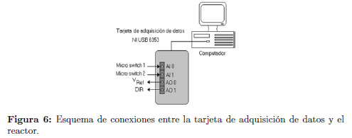 La interface analógica entre el reactor y el computador es una tarjeta de adquisición de datos USB 6353 de National Instruments®, esta tarjeta cuenta con 32 entradas analógicas, 4 salidas analógicas, 32 entradas/salidas digitales y frecuencias de muestreo máximas de 1,25MS/s. Si bien el reactor no demanda una tarjeta con las prestaciones anteriores, se utilizó esta tarjeta en el primer prototipo aprovechando su disponibilidad en el laboratorio para experimentos múltiples. Para el control del reactor bastaron dos entradas analógicas y dos salidas analógicas, las cuales se esquematizan en la Figura 6.