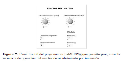 El programa que ejecuta las secuencias de inmersión y extracción de los sustratos fue realizado en el software LabVIEW 2009®3, este programa controla todas las señales adquiridas o generadas por la tarjeta de adquisición de datos, consta de un panel frontal para el ingreso de los parámetros del proceso de inmersión y un diagrama de bloques que contiene la programación de la tarjeta de adquisición de datos y las operaciones básicas sobre los datos que ésta envía o recibe del reactor.