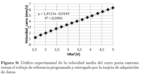 Se tomaron repetidas curvas de velocidad media del carro porta sustratos versus el voltaje de referencia VRef entregado por la tarjeta de adquisición de datos. Para medir la velocidad se registró el tiempo que tomaba el carro en desplazarse entre dos puntos separados una distancia de 10 cm, el tiempo fue medido con un temporizador digital activado por fotodiodos, con resolución temporal de 0,01 s, desarrollado en la Universidad EAFIT.Cada medida fue repetida diez veces y se tomó el promedio de los datos. Los experimentos arrojaron los resultados que se presentan en la Figura 9, donde se observa un comportamiento lineal entre la velocidad media del carro y el voltaje de referencia de la señal PWM.