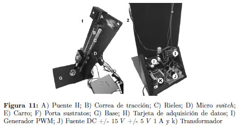 El carro porta sustratos está compuesto por una lámina de acrílico de 1,0 x 10-2m de espesor, 8,0 x 10-2m de ancho y 12,0 x 10-2m de alto, la cual ha sido sujetada con tornillos a una base metálica que cuenta con cuatro rodamientos, dispuestos de a dos en cada lado. Los rodamientos permiten el deslizamiento del carro sobre dos rieles de aluminio para garantizar un desplazamiento completamente lineal y vertical de los sustratos. Como se observa en la Figura 1 el carro cuenta con una palanca en su parte superior y otra palanca en su parte inferior, al llegar al final del recorrido cada palanca acciona la palanca del micro switch respectivo para controlar la inversión del movimiento de los sustratos.