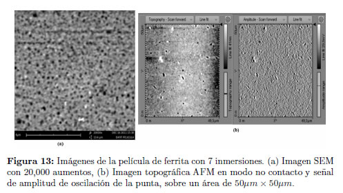 Con el propósito de observar algunos detalles de la microestructura de las películas, se tomó una Micrografía Electrónica (SEM) de la superficie de la película con 7 inmersiones y una imagen topográfica de esta misma película con un Microscopio de Fuerza Atómica (AFM). Las imágenes superficiales se tomaron con un Microscopio Electrónico de Barrido PHENOM®, modelo G2 Pro y las imágenes topográficas se tomaron con un Microscopio de Fuerza Atómica easyScan 2® de la firma nanoSurf®, operando el equipo en el modo de no contacto. Las imágenes obtenidas se presentan en la Figura 13.