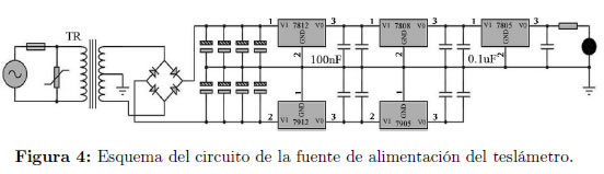 Se diseñó una fuente de voltaje regulada en régimen directo, que entrega voltajes de +12V, -12V, +8V, +5V, -5V. Estos voltajes alimentan el transductor Hall, el circuito de acondicionamiento de la señal, el microcontrolador y la pantalla de cristal líquido. La Figura 4 presenta el esquema del circuito de la fuente de voltaje desarrollada.