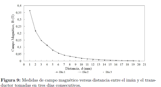 La prueba inicial del teslámetro consistió en realizar medidas de campo magnético en imanes cilíndricos de NdFeB de 2 mm de espesor y 12 mm de diámetro. El modo de operación usado en esta caracterización fue el modo frontal, donde el transductor se desplaza paralelo al eje de simetría del imán, como se muestra en la Figura 8. En las medidas presentadas en la figura se evidencia una gran simetría entre los valores positivos y negativos del campo magnético obtenidos para las dos orientaciones de los polos del imán con respecto a la cara sensible del transductor Hall.Para tener una idea del grado de repetibilidad de los resultados entregados por el teslámetro, se realizaron medidas de campo magnético en tres días consecutivos, procurando mantener las mismas condiciones experimentales. En este experimento sólo se varió la distancia entre el sensor y el imán, como se ilustra en la Figura 9.