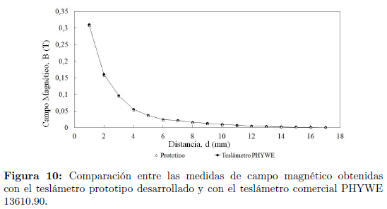 Las ecuaciones de ajuste para los diferentes datos presentados en la Figura 8 arrojaron una diferencia porcentual máxima del 0,57% en los coeficientes de autocorrelación de las curvas. La máxima desviación porcentual entre las medidas se obtiene para una distancia de 5 mm entre el imán y el sensor, con un valor del 3,5%. Esta desviación es pequeña si se considera que 5 mm están dentro de una zona con alta densidad de flujo magnético y cualquier leve movimiento del transductor puede ocasionar fluctuaciones en las medidas, especialmente cuando este se encuentra montado sobre un asta flexible, como fue el caso del experimento. En cualquier caso, se debe recalcar que la mayor parte de las medidas realizadas en condiciones similares tienen una desviación máxima entre ellas menor al 1%, lo cual indica una repetibilidad satisfactoria en las medidas de campo magnético para experimentos de magnetometría básicos. La Figura 10 presenta una comparación de las medidas de campo magnético a diferentes distancias del imán de NdFeB obtenidas con el teslámetro prototipo y con un teslámetro comercial PHYWE, referencia 13610.90, el cual puede medir campos entre 10−5 T y 1 T con un error máximo del 2% sobre el valor medido. A partir de los datos obtenidos se encuentra que la máxima desviación porcentual entre los valores de campo magnético medidos por ambos instrumentos es del 1,94%, la cual ocurre para una separación de 2 mm entre el transductor y el imán permanente.