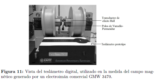 Los transductores de campo magnético constituyen una herramienta indispensable en los experimentos de caracterización magnética de materiales. El campo magnético aplicado sobre la muestra bajo estudio, bien sea alterno o continuo, debe ser medido con la mayor exactitud posible con el fin de obtener de manera confiable las propiedades magnéticas de la muestra, tales como campo magnético de saturación, campo magnético coercitivo, susceptibilidad magnética, coeficiente Hall, coeficiente de magnetorresistencia, entre otras.La evolución en los procesos de microfabricación y purificación del silicio ha permitido desarrollar transductores de efecto Hall cada vez más compactos, con bajas pérdidas por corrientes de fuga inversas y con sensibilidades ajustables a los campos magnéticos típicos de los laboratorios de magnetometría, que varían en el orden de unos cuantos Teslas. La producción a escala industrial también ha permitido reducir ampliamente los costos de este tipo de transductores, haciéndolos comunes en áreas como la magnetometría [1], industria automovilística [2], robótica [3] y ciencia básica [4]. Teniendo en cuenta la conveniencia de los transductores Hall para medidas de campo magnético en espacios reducidos, tales como los presentes en las regiones interpolares de electroimanes de laboratorio, bobinas de pequeños diámetros, entrehierros de motores, parlantes, entre otros, es una buena opción para estas aplicaciones implementar teslámetros dedicados compactos, compuestos por transductores Hall más etapas analógicas de acondicionamiento de señal y circuitos digitales basados en microcontroladores, los cuales ejecutan el procesamiento de la señal de campo magnético, permitiendo no solo visualizar las medidas en una pantalla sino gestionar los datos adquiridos, para que estos puedan ser almacenados en memoria y ser recuperados en el momento en que el usuario lo desee. Existen teslámetros comerciales con excelentes prestaciones, tales como el 13610-90 o el COBRA 4, ambos desarrollados por la firma PHYWE®1, cuyas resoluciones son de 1 parte en 1000 en cada escala de medida;el Group3 Digital Teslameter DTM-133 de la firma GMW Associates®2, con resoluciones de 100 partes por millón y errores máximos del 0.03% en las medidas; o el SF-7579 Tesla Meter de la firma PASCO®3, con resolución de 0.1 mT y errores máximos del 5% sobre el valor de las medidas. El costo de estos teslámetros oscila alrededor de los USD 6.000, haciéndolos poco accesibles para los laboratorios básicos de física de países en vía de desarrollo. Nuestro interés por abordar el desarrollo de un teslámetro digital embebido nace de la necesidad del Laboratorio de Instrumentación y Espectroscopia de la Universidad EAFIT por desarrollar infraestructura de medida con buenas prestaciones, bajo costo y ajustada a los requerimientos de medida de la línea de investigación en magnetometría, de tal forma que en el corto plazo se pueda lograr autonomía en el desarrollo y mantenimiento de los equipos del laboratorio para uso en actividades de investigación, docencia y extensión.Para avanzar en este objetivo, se desarrolló un teslámetro digital embebido para la caracterización magnética de materiales, el cual fue evaluado con imanes de NdFeBy un electroimán comercial, para establecer la densidad de flujo magnético, la polaridad y el comportamiento del campo magnético a lo largo del eje de simetría del campo. De igual forma, se analiza la repetibilidad de las medidas entregadas por el sistema y su desempeño comparado con un teslámetro comercial para validar su uso en experimentos de magnetometría.